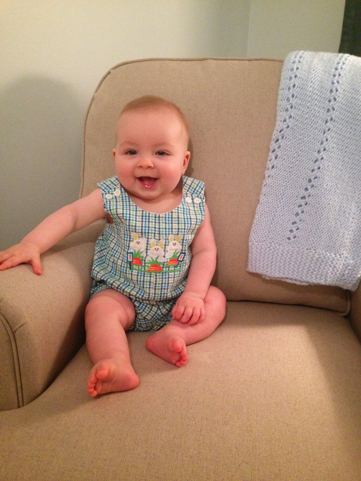 It seems like every day you are doing something new. My favorite thing you've started doing this month is saying mama! I know you are not associating the ma-ma sound you are making with my name, but it is still sweet to hear. You say it over and over, and it's the cutest thing. You also say baba a lot these days. Daddy wants you to say da-da, so we are working on that sound! You just talk up a storm all day long, and I love it. You laugh so hard at your daddy. It melts my heart to see you two interact and the way your eyes light up at the site of him. You are becoming more interested in rolling from your back to your tummy, but it's still not something you automatically do when you are on your back. You have become obsessed with Mommy and Daddy's cell phones and the remote control. Any time one our cell phones lights up, you see it and immediately drop what you're doing and grab the phone. If you're sitting in our lap and see the remote you grab it too. We finally got smart and gave you your own remote that we don't ever use! You still love to sit and play with your toys and jump in your jumparoo. You don't seem to have much interest in crawling yet, and I'm perfectly okay with it!